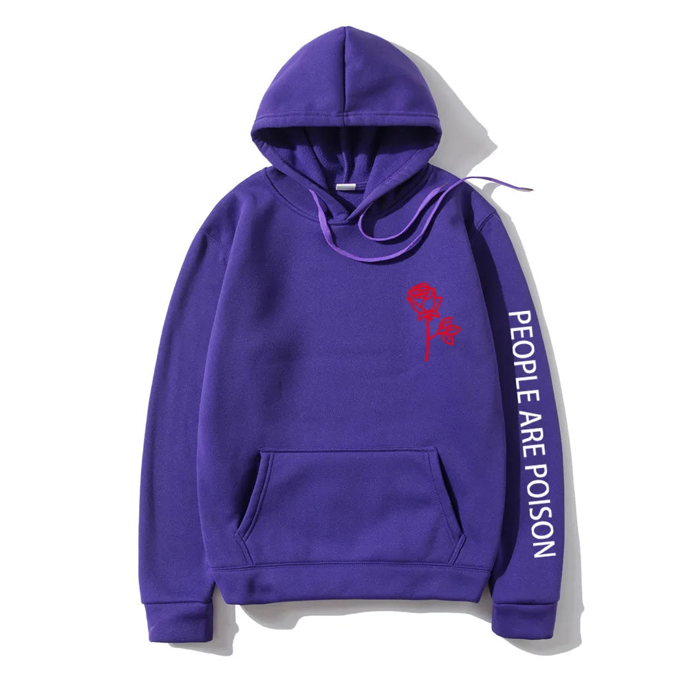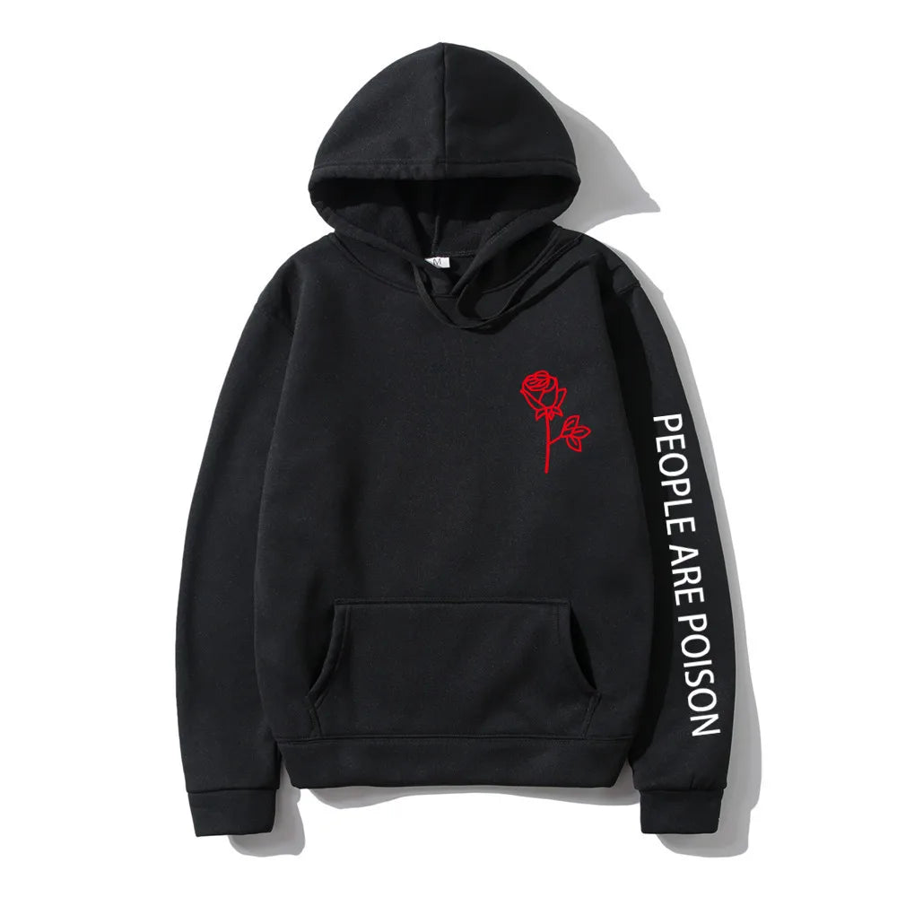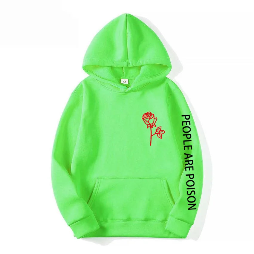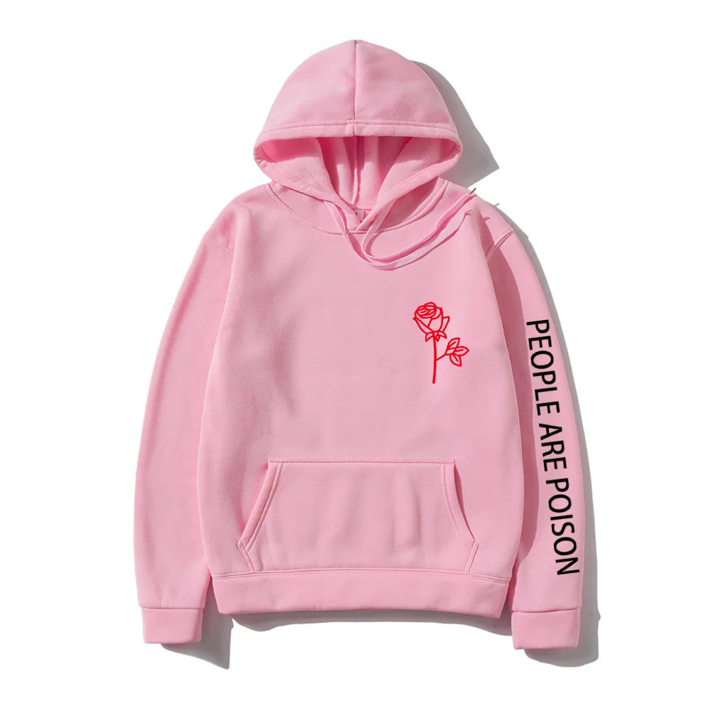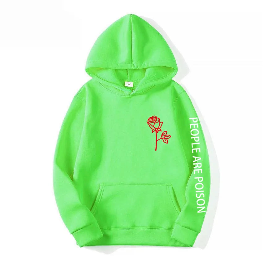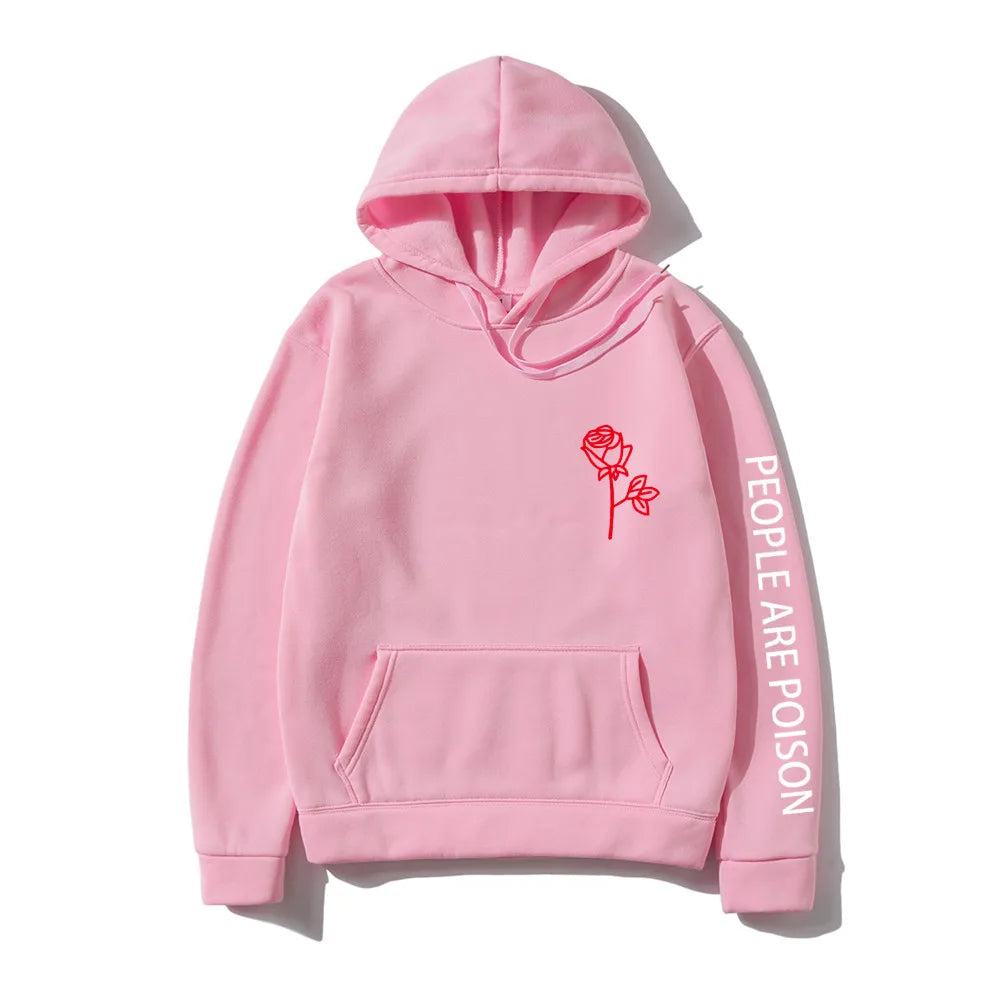 A great hoodie for the lady who has a little bad girl in her. Wear your LUNOAKVO People Are Poison Hoodie under a leather jacket or a sleeveless jean jacket. Super soft, thick cotton will keep you warm. The high neckline has a drawstring closure if it gets chilly. The front is accented with an embroidered rose on the chest and the sleeve with small lettering that give it a little edginess. The perfect hoodie to wear riding the motorcycle or to a heavy metal concert.
