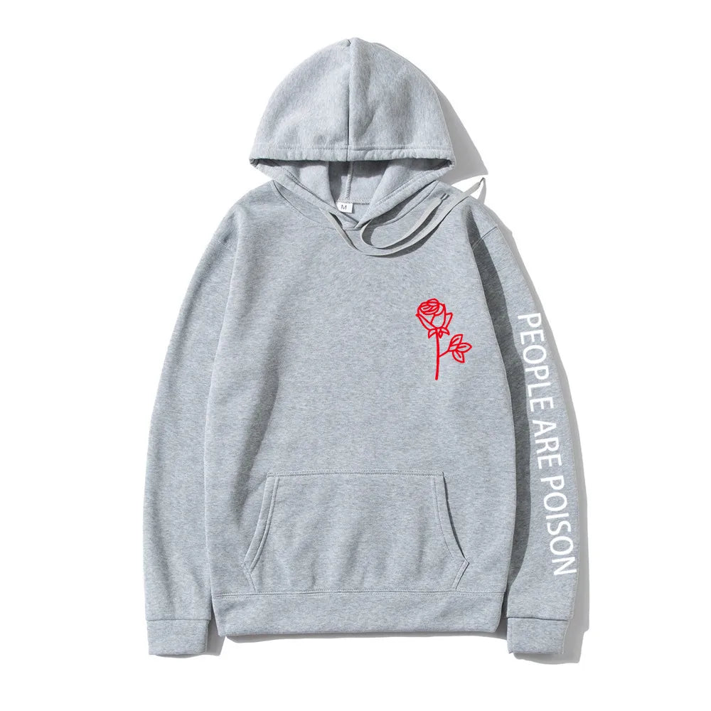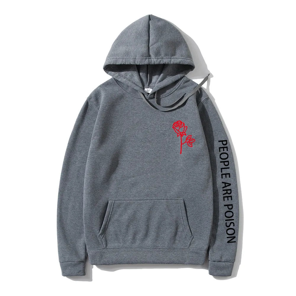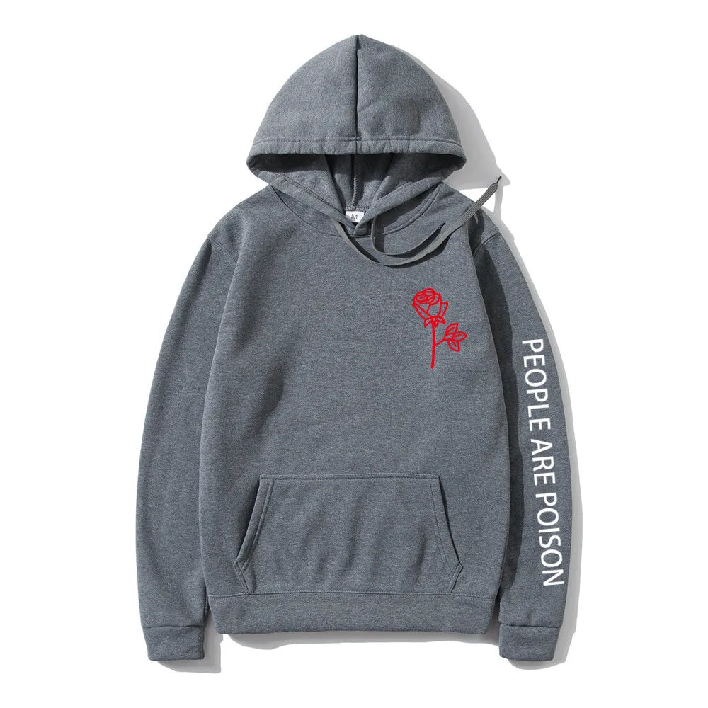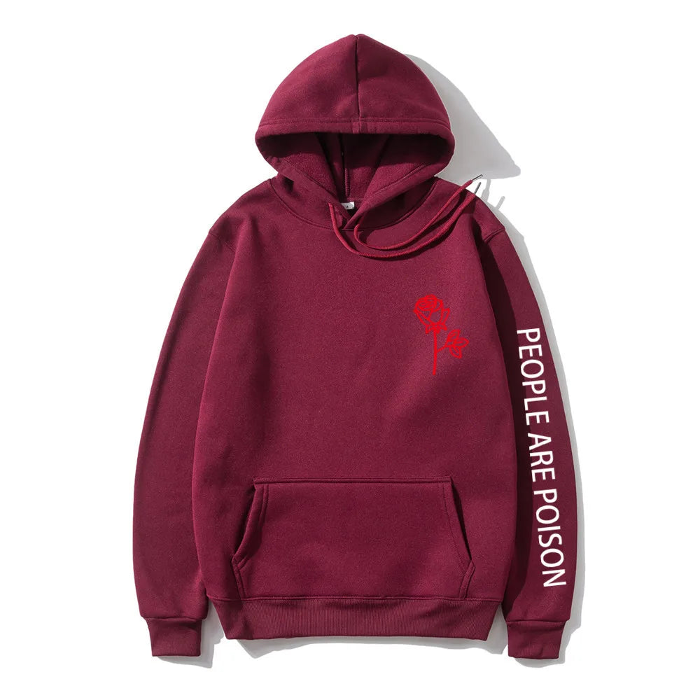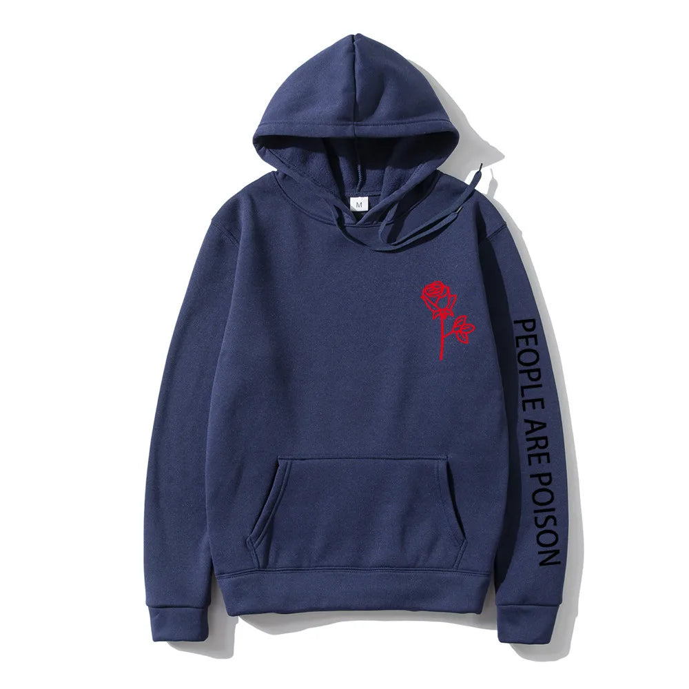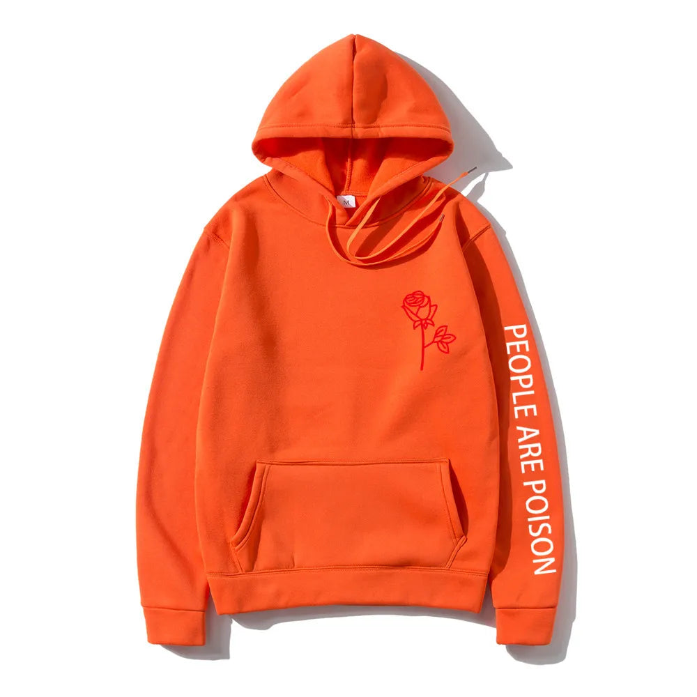 A great hoodie for the lady who has a little bad girl in her. Wear your LUNOAKVO People Are Poison Hoodie under a leather jacket or a sleeveless jean jacket. Super soft, thick cotton will keep you warm. The high neckline has a drawstring closure if it gets chilly. The front is accented with an embroidered rose on the chest and the sleeve with small lettering that give it a little edginess. The perfect hoodie to wear riding the motorcycle or to a heavy metal concert.